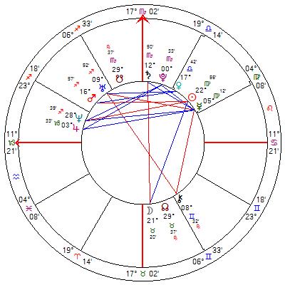 Jupiter is in the first house in Virgo, with the ascendant in Leo. This person can be quite arrogant and does talk a lot- he airs his views more frequently than does the Queen, although the Saturn eight degrees from Jupiter does keep that tendenct in check somewhat. Jupiter also rules his South Node- his views do have a tendency to be insufferable and archaic, but with the North Node in the third house (which rules Gemini), his very nature has a tendency to work past those ways of thinking. Jupiter is square the Sun, sextile Pluto, sextile Mercury and trine Venus (the inconjunct to Chiron is too wide)- his ego can be bumptious, brash and overbearing- but this is all to conceal the severe suffering he has experienced in his formative years. Like the Queen, he looks to his romantic pursuits as somewhat of an escape.