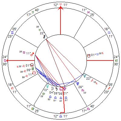 Well! A T-square to Saturn, with Capricorn Rising. Nothing can indicate any more clearly that this person is born to a life of duty, restrictions- privilege perhaps, but there are definite blocks to this person’s freedom in life. When we note that that Saturn rules her ascendant and also squares her Mars/Jupiter conjunction, that limitation is even more underlined. I also note that I am writing this on her birthday- I did not know that before 🙂